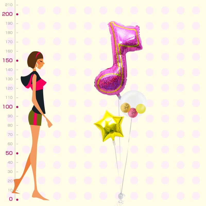 大きなピンクの8分音符とプチバルーン、ゴールドスター【ピアノやバレエの発表会のバルーン電報】